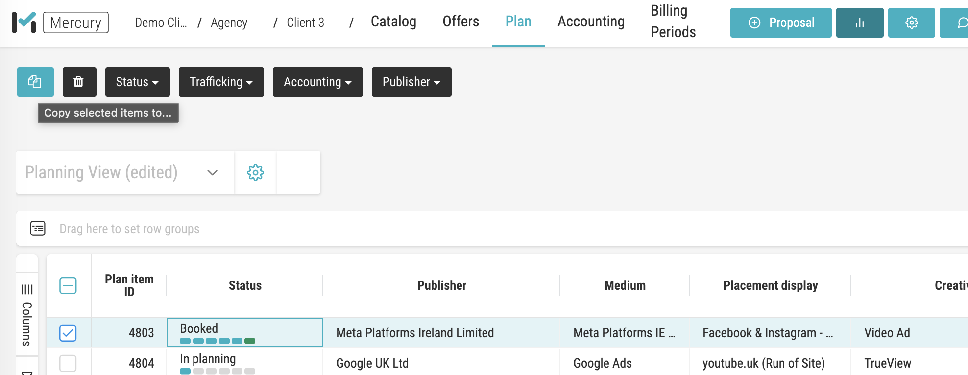 Note: Mercury only allows copying on the same category level or below. A workaround is to copy the plan item into a new campaign and then move that campaign to the desired location. You can either continue working with that campaign or copy the plan item from it into the new target campaign.