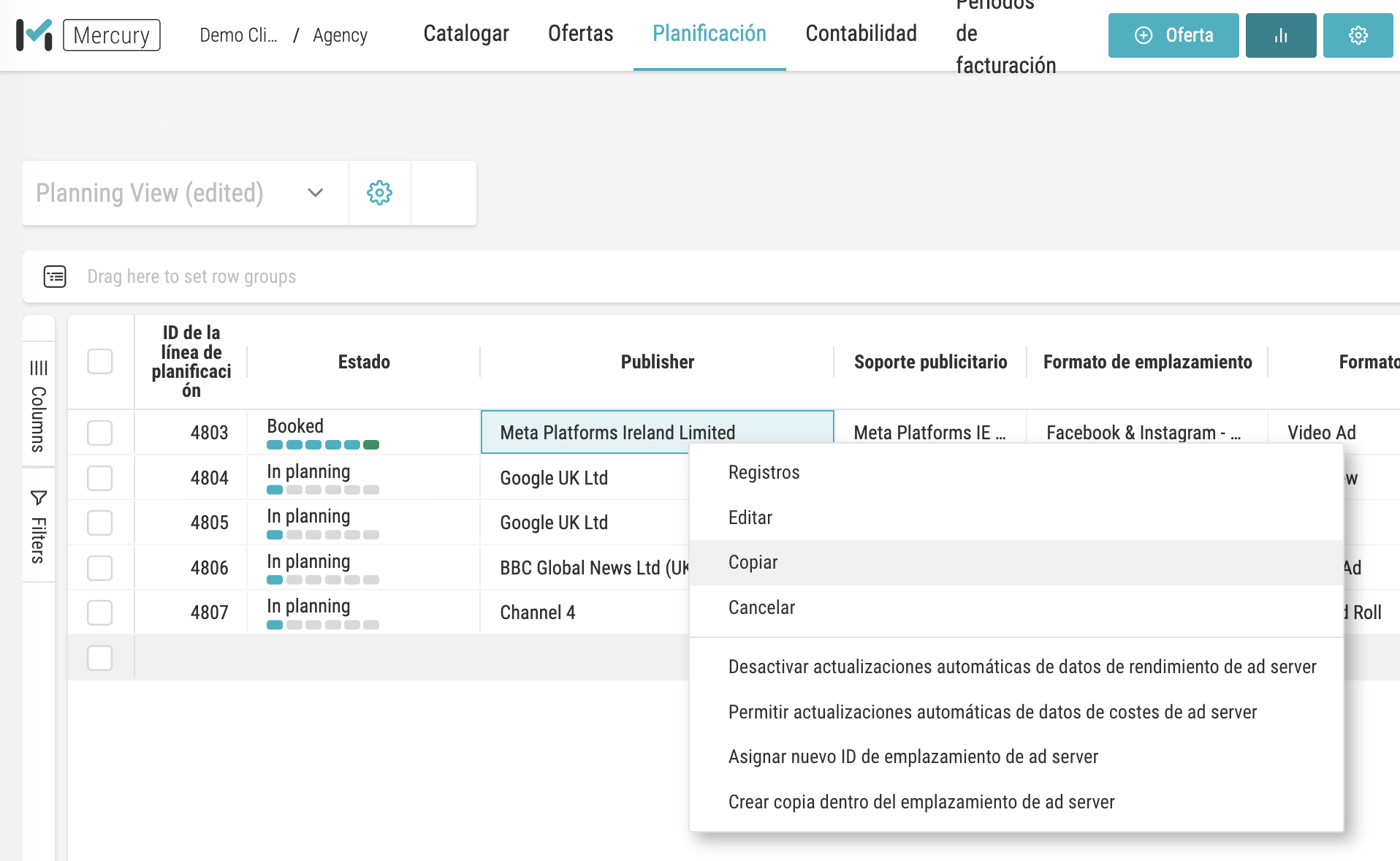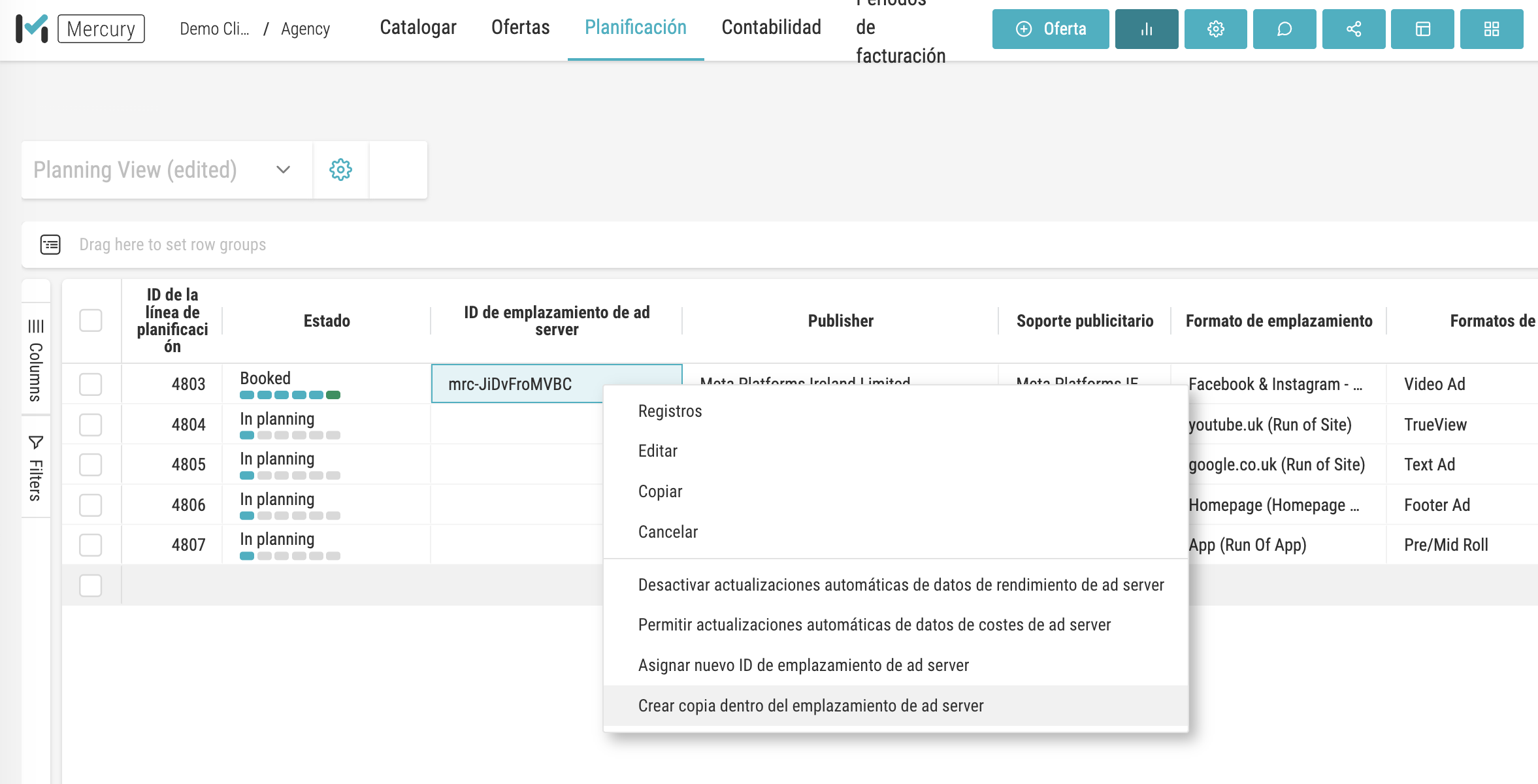 - Mercury creará una nueva copia de la línea de planificación, siempre sin la ID de ubicación del AdServer