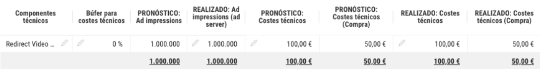 Muestra los costes internos calculados automáticamente de los componentes técnicos en función de su precio de compra y el volumen de la línea del plan.